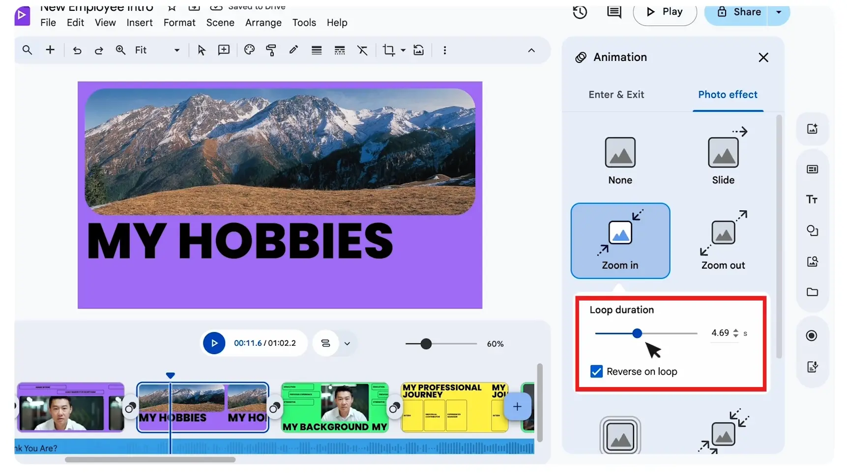 | Hiệu ứng Ảnh (Photo Effects) | Biến ảnh tĩnh thành động thông qua các kỹ thuật thu phóng (Zoom) hoặc trượt ảnh (Pan), tạo cảm giác thước phim đang trôi. |